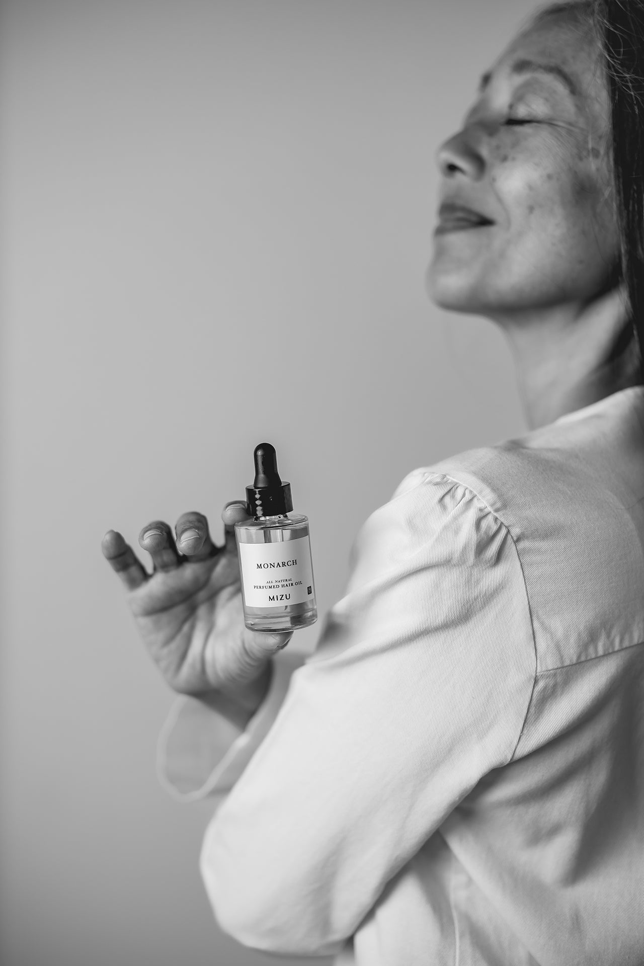 I adore MIZU fragrances and have a collection of MIZU creations. Whether it’s perfume, hair oil, candles, or mood mists ( I still have a few ), I use whatever scent I’m drawn to in the moment. I notice that MIZU perfume often speaks to me seasonally. In general, I find myself attracted to Moonflower in the spring, Wild Vetiver in the summer, and Monarch in fall/winter. Temple seems to grab me at random times, but mostly early fall and early spring.